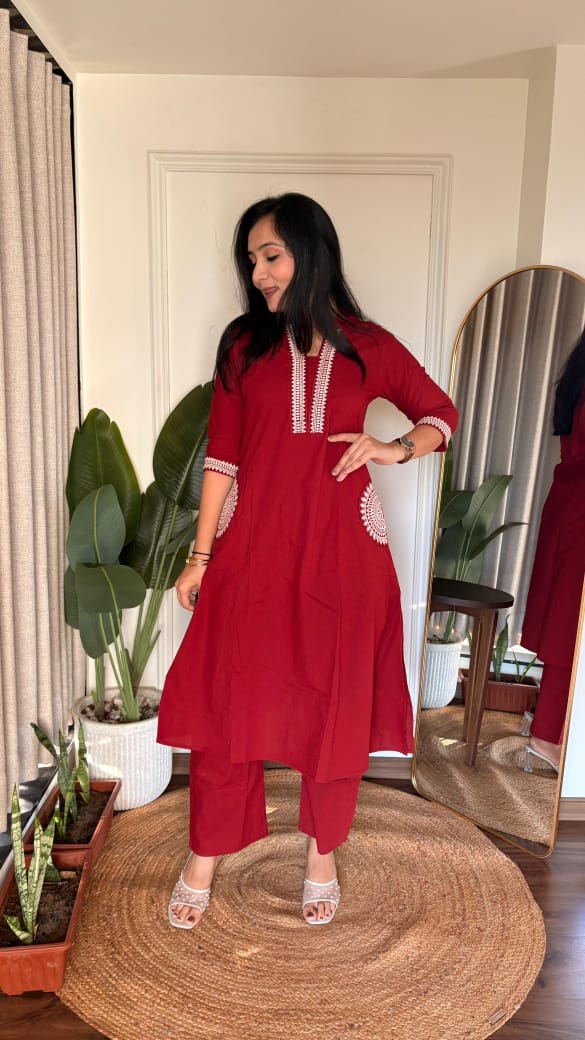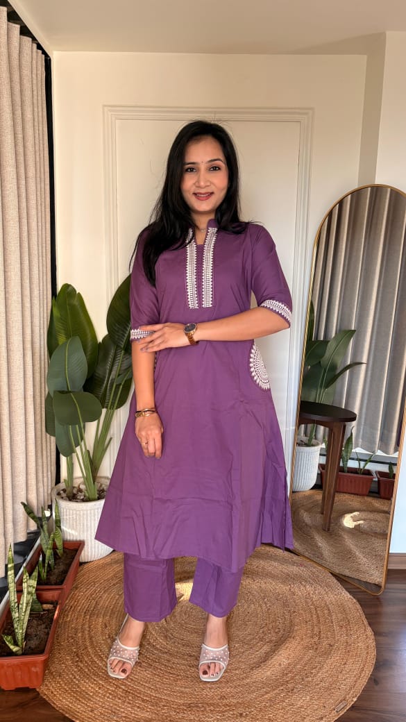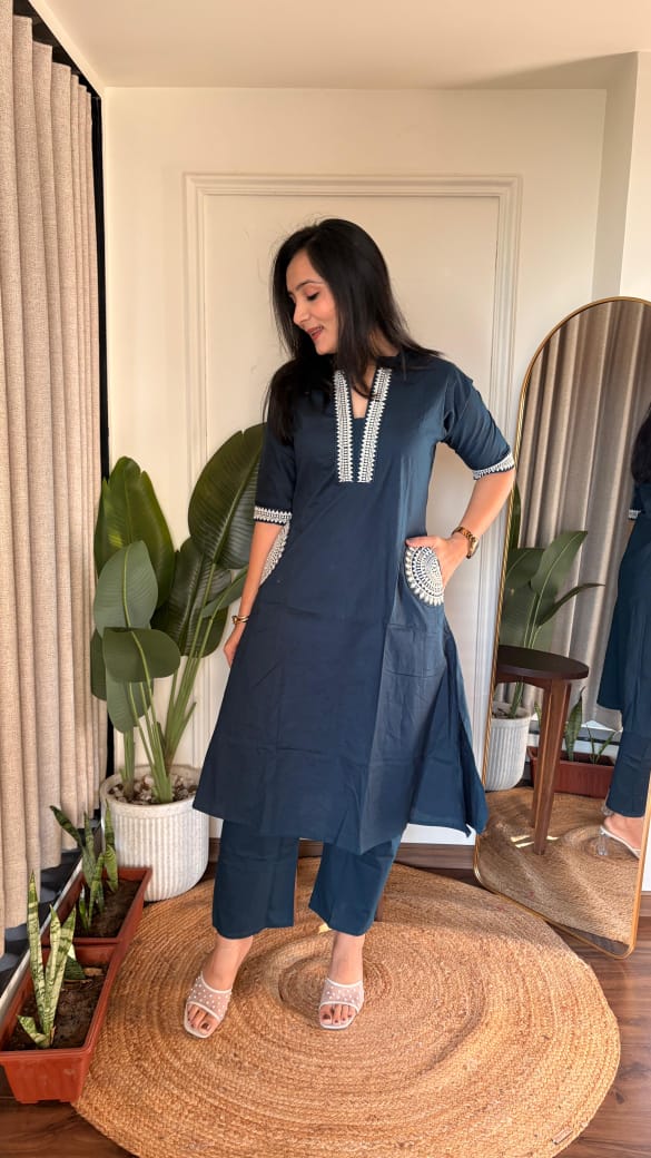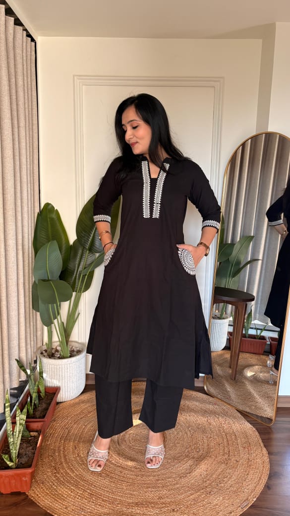 Beautiful A line kurti with palazzo , with work on neck and pocket